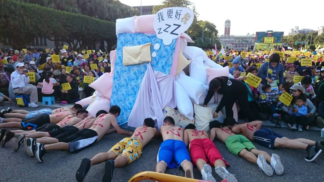 十個年輕人赤裸上身,在背上寫著「法稅真改革,良心救台灣」的紅色字樣,表演「稅不好、睡凱道」行動劇。 分享此文: 按一下以分享至 Facebook(在新視窗中開啟) Facebook 分享到 line(在新視窗中開啟) line 按一下以分享到 Telegram(在新視窗中開啟) Telegram 按一下即可分享至 X(在新視窗中開啟) X 喜歡 正在載入... 相關