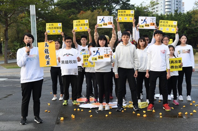 法稅改革聯盟青年志工謝建桐說,台灣稅制不透明導致企業外逃、外商不敢進台設廠、就業機會減少、薪資凍結,但稅收卻還能年年超徵千億,這一連串的問題讓青年看不到未來,而身邊的同學也紛紛離開台灣。他呼籲政府法稅真改革,稅制透明化,廢除違法的財稅函釋,讓外商敢投資,年青人的未來才會有希望。