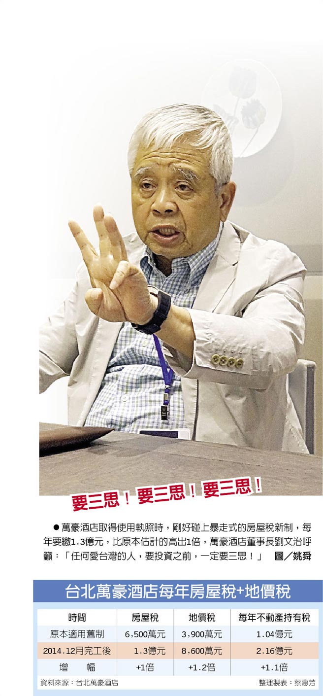 劉文治表示,現在台北萬豪酒店1年的不動產持有稅賦(房屋稅+地價稅)總計要2.16億元,比原本舊制試算的元高了1倍(1.04億),而且將來房屋稅、地價稅可能還會繼續漲,我們再怎麼努力,飯店也可能永無盈餘之日。政府口口聲聲要提振觀光業,但政策根本是在殺雞取卵。