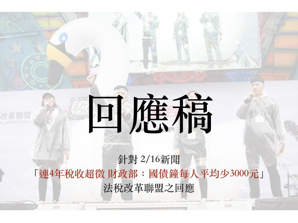 針對2月16日財政部在新聞《國債鐘每人平均少3000元》中之說詞,法稅改革聯盟回應如下。