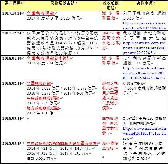面對全民要求政府四年超徵款五千億要退還人民的聲浪,今年財政部對外發布的新聞,一再修正數字,先將2017年度的超徵金額修正為774億元,才一個月,又修改為960億元。今年3月19日甚至將四年超徵稅收總計5千多億,改成3,651億元(詳見附表),仔細探究其原因,財政部竟以中央政府超徵稅收取代以往發布的全國超徵稅收,根本是愚弄人民。