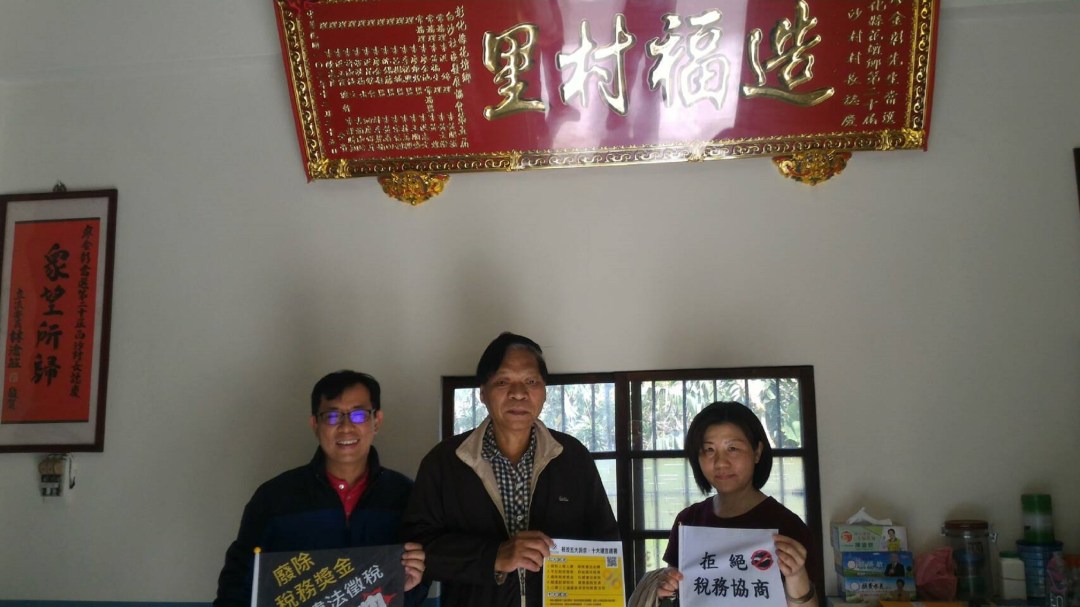 圖1:彰化縣花壇鄉白沙村廖村長(中)認為,法稅改革聯盟是在做一件功德無量的好事,義不容辭加入推動稅改的行列。