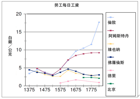 與法國大革命同時代的英國,卻是政府嚴控預算平衡、建立金融信用、吸引全球資金、誘發工業革命,形成良性循環。英王查理一世濫稅,被議會公開斬首(1649);其弟詹姆斯二世復辟,意圖壓制議會,議會乃迎立其婿荷蘭執政威廉三世兼任英王,是為光榮革命(1688)。威廉三世簽署議會提交之《權利法案》,最重要的一條即是「國王非經議會立法不得徵稅」,此後英國不再有濫稅,因此官員也很難貪污。正因為不能濫稅,必須靠廉能的文官團隊和徵稅法制才能維持收支平衡,這也使英國政府的信用良好,資金因而不斷流入英國,讓倫敦成為世界金融中心。威廉三世趁機將荷蘭的銀行、股票、債券、貨幣等金融制度引進英國,後世稱為金融革命。有了完善的金融制度,瓦特才有資金從事長期的技術創新,把蒸氣機改良到可以大量應用在產業,啟動了工業革命,創造重大經濟效益。1775年後拜工業革命之賜,倫敦勞工薪資有突破性成長,如附圖。此後,英國成為世界第一強權稱霸百年。