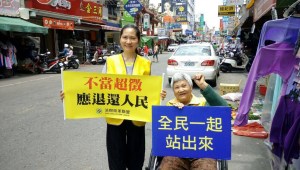 民眾不遠千里來紫南宮,排隊祈求發財金,只為了能多賺點錢,讓日子好過些。游小姐表示,其實稅務員只要能本著良心依法課稅,不要違法濫權亂開稅單,將超徵的五千多億退還人民,老百姓就能安居樂業,好好賺自己的發財金。她的媽媽因為脊椎磨損退化,導致雙腳沒力,近日須以輪椅代步,但聽完女兒的分享,認為讓全台灣的人知道超徵應該退還人民這件事很重要,很有意義,因此即使行動不便,在大太陽底下曬得「黑金黑金」,汗流浹背,仍舊滿心歡喜,一點都不覺得累。路人也為這對母女加油打氣,並表示,政府是非要分明,這樣就對了!