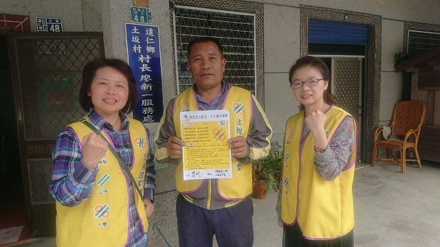 土坂村廖新一村長說,擔任部落村長7年來,村民出生率趕不上死亡率,年輕人都在外地工作賺錢,錢賺的少都不敢生,薪水已經養不起一個家,叫志工一定要加油,監督政府改革。台坂村溫光林村長更積極聯繫還沒連署的2個村落村長,一起推動法稅改革。
