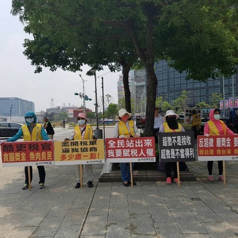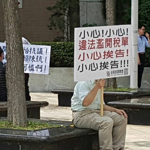 五月報稅季進入尾聲之際,到台北國稅局報稅的民眾絡繹不絕,但國稅局大門外卻設下重重路障,離路障不遠處一群穿著黃背心的法稅改革聯盟志工,靜默的高舉著看板表達希望政府落實稅改訴求,但國稅局門口的層層拒馬,明顯是拒絕與民眾良性溝通,與國稅局大廳斗大的賦稅願景寫著:「建構優質賦稅環境,維護租稅公平合理」,顯得格外諷刺!志工們手持「濫開稅單怕陳抗!鐵鍊深鎖賴陳抗!可憐啊!可憐啊!」「小心!小心!違法濫開稅單 小心挨告!小心挨告!」「全民站出來 我要賦稅人權」,高溫下無聲的表達人民衷心的訴求。