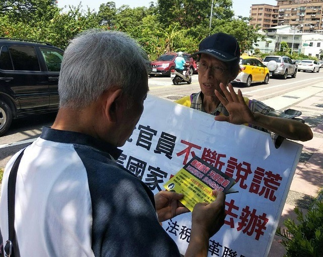 5月18日攘往熙來的桃園北區國稅局外,一群法稅改革聯盟志工頂著超過35度的大太陽高舉著「廢除稅務獎勵金」、「反超徵 反低薪」、「政府超收還人民 政府民代已承諾」等標語表達人民心聲!一位林姓建築商投訴,自己因為土地開發引起課稅問題;林先生認為,稅捐機關課徵項目、金額均不合理,幾經申訴仍得不到合理答覆,除了花錢聘請律師打官司外,自己也認真鑽研稅法,本來以為法院會依法判決,但法官卻對他有利的證據視而不見!因此孤軍奮鬥了九年,案件依然在行政法院纏訟中,他去投訴納保官也得不到幫助,對於官員的霸道,以及法院的判決不公讓他有冤難申、氣憤不已。林先生表示,政府太腐敗!他也要參加這有意義的稅改行列。