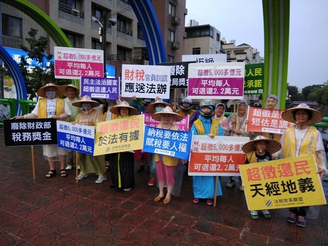 財政部統計,今年5月全國稅收3,790億元,年增24.4%;前五月累計稅收達8,547億元,創歷史新高!而綜所稅更是比去年同期增加46億元,稅制不公讓人民痛苦,法稅改革聯盟志工,舉牌宣導「納稅要依法 賦稅要人權」,呼籲政府超徵還民、撤銷違法稅單,廢除沒有法源依據的稅務獎勵金。