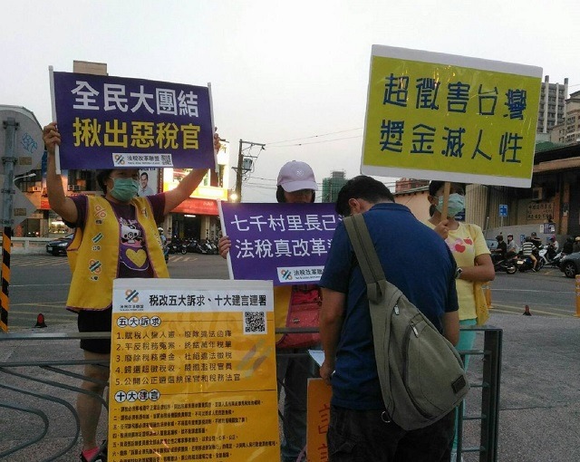法稅改革聯盟志工持續宣導改革,邀約民眾連署。一位退休的沈女士,說她知道超徵的事,所以過來連署,她也質疑,政府收了稅後,到底為人民做了那些建設?民眾連署完跟志工表示,希望每個生活在這塊土地的人們都能一起來推動法稅改革,許台灣一個美好的未來。