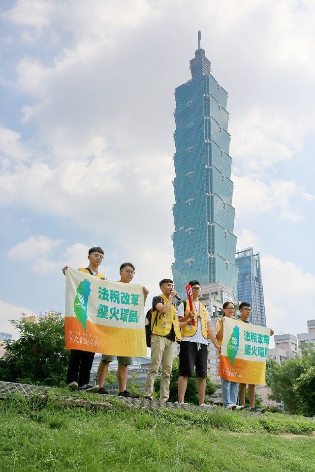 9月2日環島聖火第一天行程,上午十點特別從台北101出發,象徵萬丈高樓平地起,推動法稅改革要從根基著手。101旁的四四南村一早聚集了很多前來歡送的志工與民眾,為環島行動加油打氣!熱情的志工朋友,以各式加油道具標語,給予環島青年聖火大使滿滿的鼓勵,充滿前進的能量。