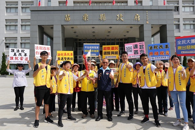 法稅改革聯盟所提出的稅改五大訴求、十大建言及賦稅人權宣言連署,經志工深入全國7,860個村里一步一腳印推廣宣導,全國每一村里皆有人參與連署,象徵全國100%的民意!9月2日法稅改革聯盟青年志工從台北101大樓出發,展開「聖火環島 點亮希望」行動,繼5日法稅改革聯盟青年志工持聖火環島,行經苗栗地區,受到民眾及村里長熱烈響應之後,於9月11日上午來到苗栗縣政府前廣場,舉行「法稅改革點亮台灣 聖火傳遞照亮苗栗」傳遞儀式,由縣長徐耀昌親自接過聖火,並交棒給苗栗在地青年,點燃苗栗法稅改革的希望之火。