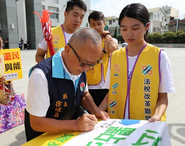 縣長徐耀昌曾表示,繳稅是國民應盡的義務,但財稅機關諸多不合理的課徵、法則不一的課稅方式,常造成個體戶、公司行號、公益社團、宗教寺廟等極大的傷害。建議財政部門應該規劃一條鞭的政策,落實稅法法治化,講求道理與誠信,才能得到人民的信賴。並鼓勵法稅改革聯盟,能夠得到全民的託付,讓中央政府了解人民對稅務改革的期待。