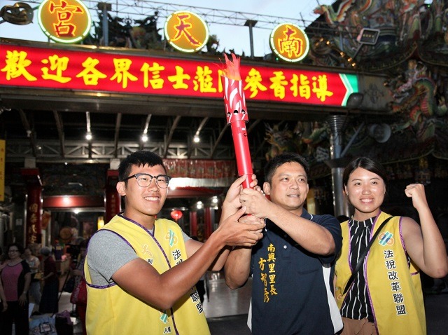 法稅改革聯盟 9/1 晚上在新北市板橋第一運動場,啟動「Young Power!法稅改革 點亮臺灣」行動,在近萬人見證下點燃環島聖火,交棒給來自11所大學的12位青年代表擔任環島聖火大使,沿途全台村里長接力傳遞聖火,讓希望之火點亮台灣每一里。聖火環島隊伍9/12傍晚,抵達位於宜蘭縣蘇澳鎮的南天宮媽祖廟,蘇澳鎮鎮長陳金麟、縣議員邱嘉進、蘇澳里長聯誼會會長張誠烋、南建里里長吳金龍、蘇東里里長陳進明、聖愛里里長陳文財、南興里里長方智彥、縣議員候選人吳淑貞及鎮長候選人李明哲出席,從青年志工手中,承接稅改聖火,讓希望之火點亮美麗的蘭陽平原。
