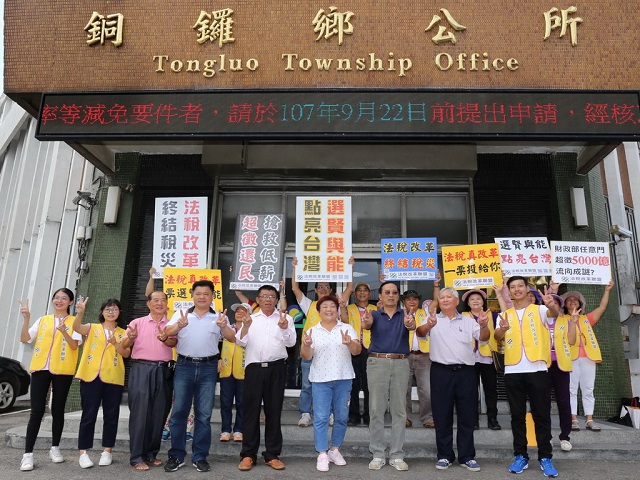 法稅改革聯盟在地青年聖火隊,接著又到了銅鑼鄉鄉公所,由銅鑼鄉鄉長張正秋帶領竹森村村長李坤松、福興村村長林明昱、朝陽村村長吳憲瑜、銅鑼村村長黃建春、樟樹村村長吳興紹等五位村長熱烈迎接聖火隊。也各別在法稅改革大旗上簽名,期許「法稅改革、終結稅災」、「搶救低薪、超徵還民」、「選賢與能、點亮台灣」。