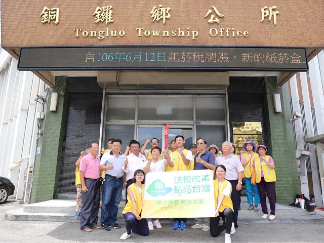 銅鑼鄉長張正秋表示:非常感念志工們全台走透透,為了我們法稅的改革,為了節省我們人民的財產,也為了未來我們國家的進步,那麼熱心的推廣,由衷的感謝各位,當然在我們地方需要配合的,我們都儘量的配合,法稅改革是必要的,我們為了國家的發展,是應該要有這樣的觀念。銅鑼村長黃建春也高呼「法稅改革,聖火傳遞,點亮台灣,Go!Go!Go!」齊心傳遞稅制改革的力量與希望的種子到銅鑼鄉,共同打造美好、安定的生活願景!