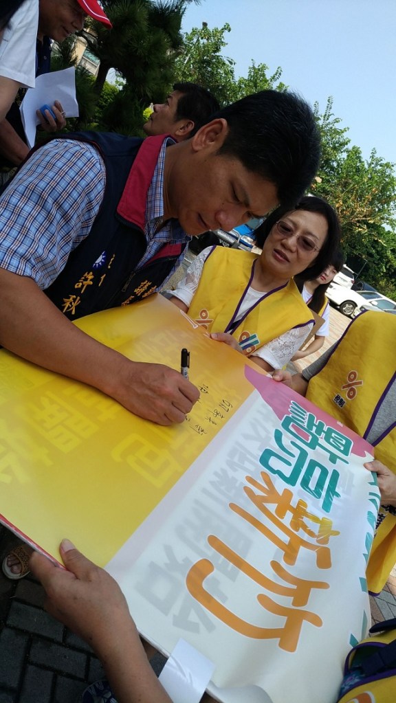 新豐鄉代理鄉長郭慧龍在稅改大旗上簽名表示對稅改活動的支持與肯定,他表示:「法稅改革聯盟的稅改建議都非常具體,各財稅單位應該審慎思考並修正。」他並肯定志工用聖火傳遞的方式走遍全台灣各鄉鎮,是一個非常大的耐力考驗,對所有的志工致上最高的敬意與謝意。