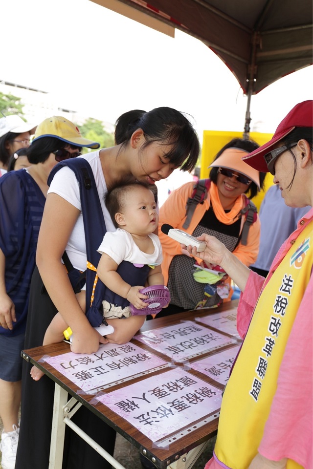 「環島聖火點亮希望, GOGO! 」、「法稅真改革 良心救台灣」、「青年創造時代!」台上青年志工喊口號,呼籲人人有賦稅觀念,國家有希望,台下民眾熱血沸騰揮動稅改旗幟,讓這股稅改浪潮達到高點,再次顯示人民的力量,人民才是國家的主人。高齡98歲李先生也來當法稅志工,已經參與很多場稅改活動的李阿公說 ,看到政府因人民團結為稅改努力而有點改變,希望大家能繼續堅持讓台灣更好。