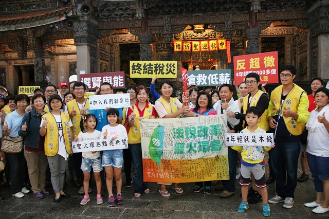 清水祖師是福建泉州安溪的一位高僧,在世除了造橋、施藥造福鄉里,圓寂後更是求雨驅蟲,每禱必應,被朝廷封賜為神靈,隨著安溪移民來台,被視為地方重要的保護神祉。除了稅改青年志工外,現場還來了一群居住當地的志工,村姑、村夫打扮跳起「還我兩萬二」的KUSO神曲,即便下著雨,也澆不熄志工們滿腔的熱情!