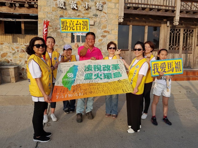 稅改聖火環島9/2從台北101大樓出發,在各地掀起稅改旋風,獲得極大的迴響。聖火不僅點亮台灣,9/21更傳遞至馬祖北竿,北竿鄉代林加友、塘岐村村長陳嘉文、橋仔村村長陳麗君迎接聖火後,在法稅改革團旗上簽名,表達希望政府落實稅改的心聲。林加友表示,人民生活困苦,依然依法繳稅,但是政府並沒有好好運用資源反而浪費公帑,國家整體結構真的需要檢討與改進,對志工們的辛勞至表欽佩。陳嘉文表示,現行的稅務法令已不符合時代的需求,必須要改革與修正;台灣經濟不好,人民努力工作卻要繳很多的稅,心裡真的很不平衡,「超徵」應該退還給人民。陳麗君深感聖火傳遞的重要與偉大,雖然對紫外線過敏,仍不畏艷陽高照,特地趕來迎接聖火,並對志工們的用心加油打氣。
