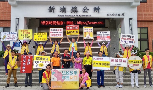 法稅改革聯盟9月24日將稅改聖火傳到新竹縣新埔鎮,田新里里長劉興堃、北平里里長張泉霖、新生里里長劉錦泉及鎮民代表候選人鍾淑琴都出席參與。