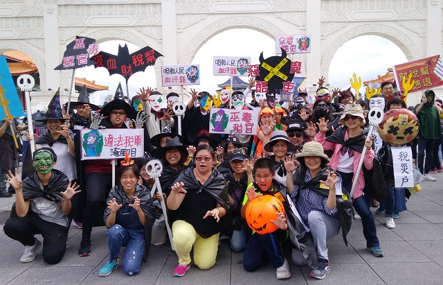 稅官違法濫權,民眾哀鴻遍野!遊行隊伍出現遠從高雄來的鄉親,以各式萬聖節裝扮上身,並大喊:「不繳錢 就搗蛋!」業務員李先生扮吸血鬼,他說財稅幫像在吸人民的血,違法課稅讓人民因而重病纏身、憂鬱症、妻離子散、家破人亡,不一而足;扮巫師的高中生盧同學表示,不良稅官亂開稅單、隨意更改金額,就像惡毒的巫師;扮惡魔酷吏的小學生:「多少繳一點吧!」業務員王先生也扮惡魔酷吏反諷:「管他法院說什麼!管他正義是什麼!反正我要開單,只要我爽什麼都可以,以後臺灣要變鬼島了!」