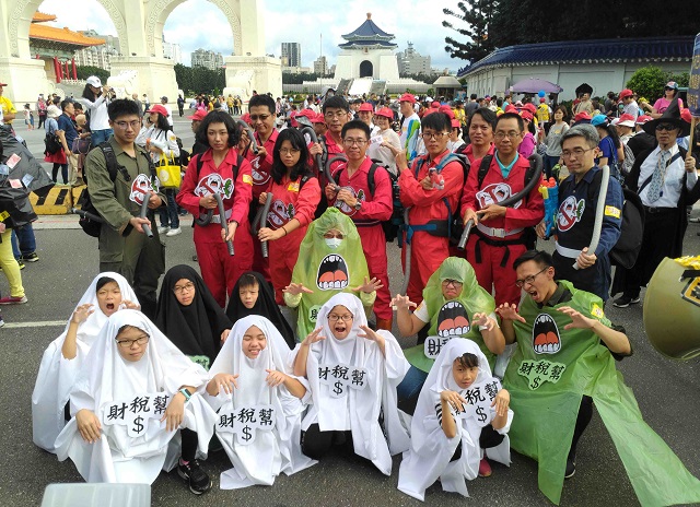 台灣稅制不公、稅災氾濫重傷經濟,大量企業人才出走,影響民生及就業,為表達對當前法稅制度的不滿,11月4日法稅改革聯盟等十多個民間團體發起「讓孩子留在台灣 稅改大遊行」活動,上萬群眾從自由廣場遊行至凱道,漫長人龍中有各世代創意裝扮,更有人打扮成抓鬼特攻隊,要求小英揪出長期隱身政府中搞鬼的「財稅幫」,平反稅務冤案、改善救濟制度,並嚴懲濫稅官員。