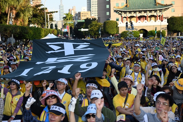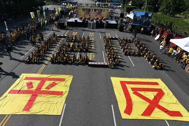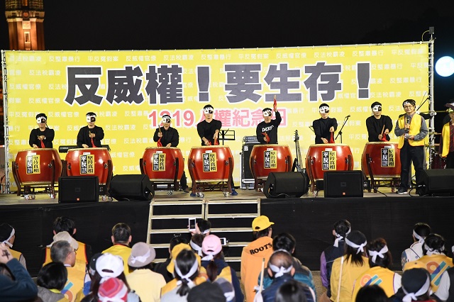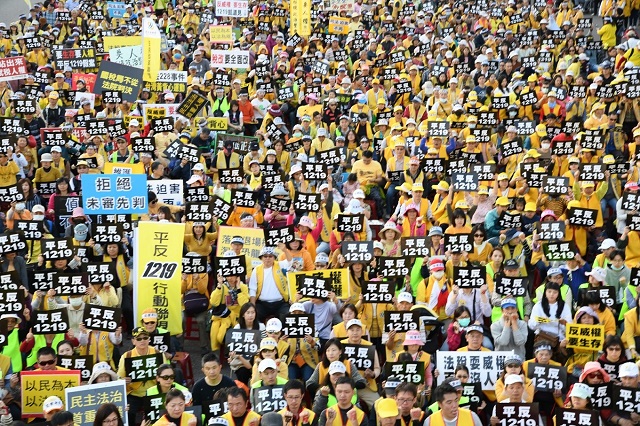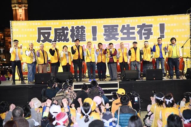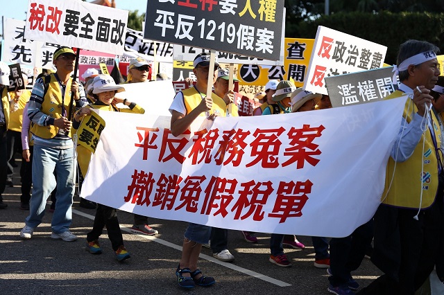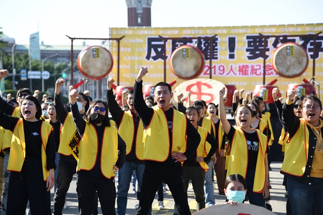 悶經濟、低薪、高工時壓榨台灣人,政府卻連年稅收超徵?外資不來、企業出走,原本穩定社會重要力量的中產階級也在貧窮線上掙扎,台灣成為全球出生率低、人才外流最嚴重的國家之一。青年世代不敢婚、不敢生的青貧世代,遠離家鄉去打拼。12月19日民眾吶喊「反威權!要生存!」選後上萬民眾上凱道,青年演出行動劇「財稅幫不倒 台灣不會好」,揪出台灣二十多年來法稅惡質化、霸凌人民的黑幕,釀冤獄、搶獎金不手軟,踐踏人權成了升官發財的捷徑?百人組成的人體骨牌,志工排出「1996」、「假」、「貪」、「1219」字樣,顧不得身體碰撞、受傷,也要「推倒法稅高牆」,爭取法稅正義。許多專家學者到場聲援,共同拿大槌子推倒骨牌。