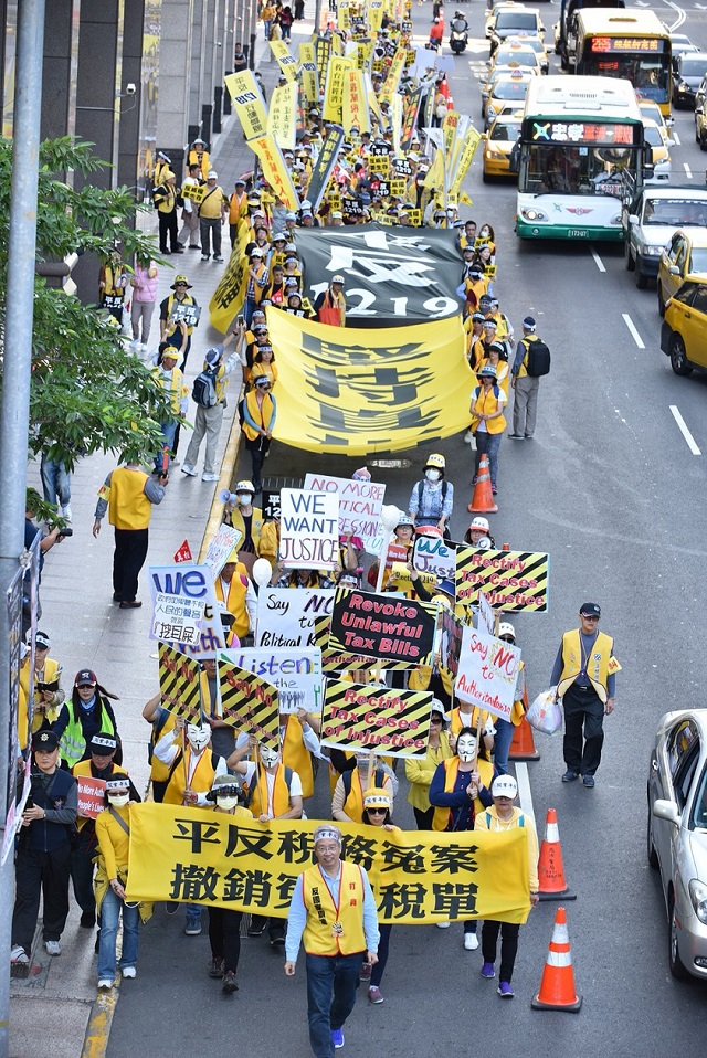 立委黃國昌也來到現場,他表示,去年立法院推行的納保法不夠好,然而在納保法施行之前,遇到租稅案子,國稅局無理,透過爭訟程序,人民勝訴比率非常低,一百個案件,勝訴案件只有七件。今年納保法施行第一年,光這一年,法官援引納保法條文,人民勝訴從7%升到14%,他指出這是倡議法稅改革民眾努力的成績。為什麼違法課稅案件,在行政法院一而再再而三勝訴,國稅局卻繼續開單,納稅者權利要到何年何日才有保障?今年夏天最高行政法院的一個判決,讓萬年稅單看到曙光,要繼續監督高等行政法院法官有沒有按照最高行政法院的判決意旨,依據納保法和人權保障的精神,發揮法官的道德勇氣,讓案件畫上句點。他也提到自己在立法院沒有辦法容忍看到貪官汙吏、看到幾億到幾百億被貪汙,政府卻沒有追究的行動,實踐公義的道路走起來辛苦,大家共同努力。