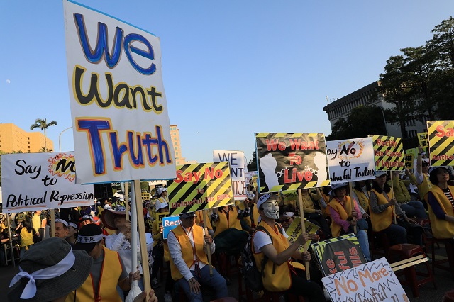 今年是聯合國頒布「世界人權宣言」七十周年,台灣人權水準遠遠落後於國際。記者會最後以壓軸——「擊鼓」,昭告天地的氣勢,號召民眾出發遊行,全民跺腳並高喊「反威權!要生存!反稅暴力!反稅霸凌!」包括中南部的民眾也趕來參加,甚至從美國、加拿大、紐西蘭、中國大陸、日本、澳洲、英國、宏都拉斯、印尼、菲律賓、越南、馬來西亞、法國、奧地利等專程回國聲援。遠從加州來參加,移民美國超過二十年的陳小姐說,以前在她心中台灣是一種驕傲,如今因為稅制不透明、不公正,經濟力大幅下滑,「我的家鄉怎麼淪落成這樣?讓我很不忍心。」陳小姐痛心呼籲台灣政府要落實法治與民主,這是奠定美國經濟繁榮的基礎。