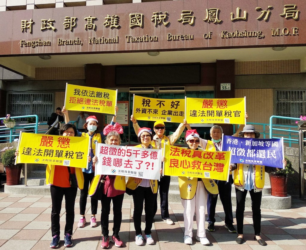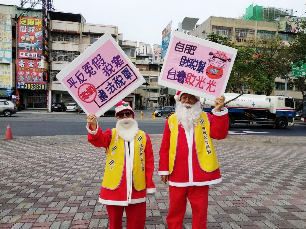 聖誕節聖誕老公公上街頭舉牌抗議!台灣稅制不公,低薪、高工時壓榨,人才外流嚴重,政府不解決問題也不聽人民的聲音!法稅改革聯盟志工裝扮聖誕老人,於高雄地區及財政部高雄國稅局鳳山分局前舉牌抗議,經濟低迷財政部卻連年超徵稅收不還民,希望政府體認人民才是主人,法稅真改革,良心救台灣!