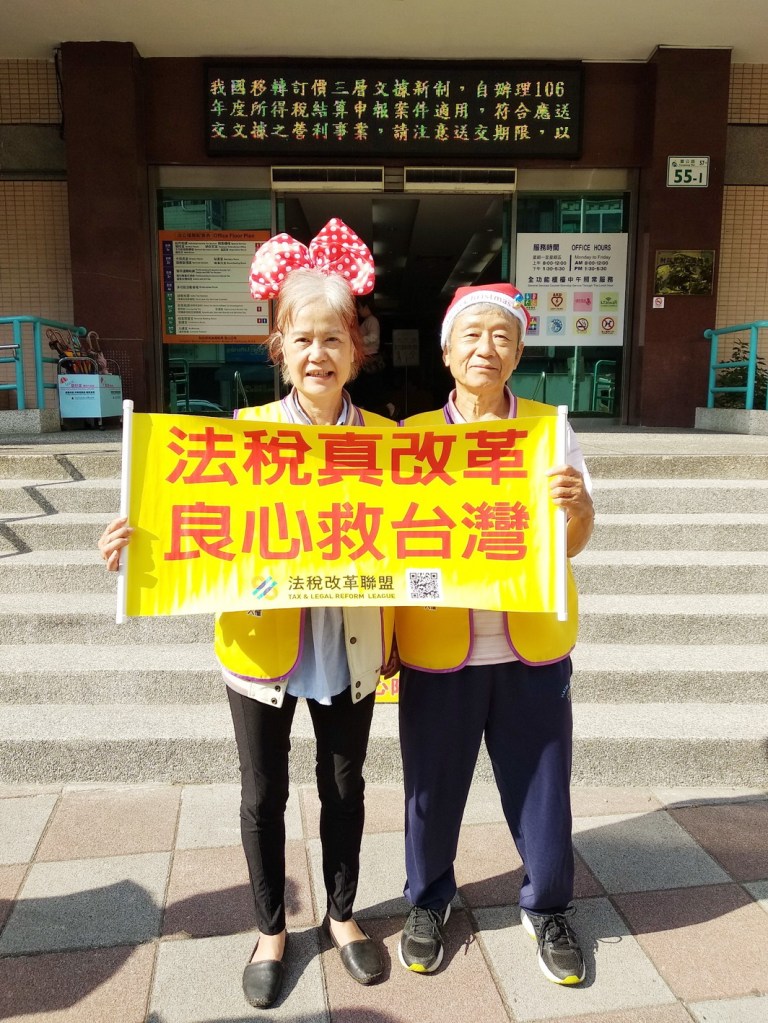 另一位60多歲陳姓志工表示,人民才是國家的主人,財稅幫把持國家財經,政府不重視管理國家財政,假案、假稅單、假新聞,製造「假」案來升官,有人諷刺「升官發財要人幫,不如加入財稅幫」,官員犯罪由人民買單,稅官開錯稅單不用負責任,財政部2014年到2017年4年超徵5千多億,幾天前財部保守估計今年稅收超徵600億元,稅收來自人民的薪水,薪水沒漲稅收卻急速增加,政府連年稅收超徵不還人民,錢進大水庫黑箱作業,謊稱還國債,國債卻越來越多!