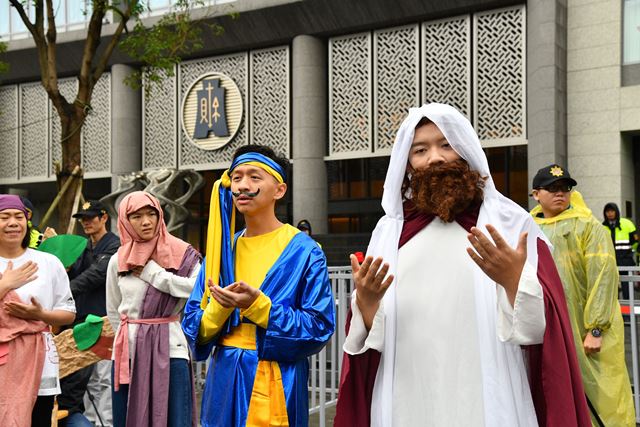 熱血青年改編聖經故事「撒該,快下來!」行動劇,現場還有背負巨額稅單的「重量級」稅災戶揭露台灣稅制黑幕,同時法稅改革聯盟發起人陳志龍教授、連福隆教授、前台南縣長蘇煥智等多位專家學者現身發聲,呼籲政府官員遵從人民意志,即刻進行全面稅改。