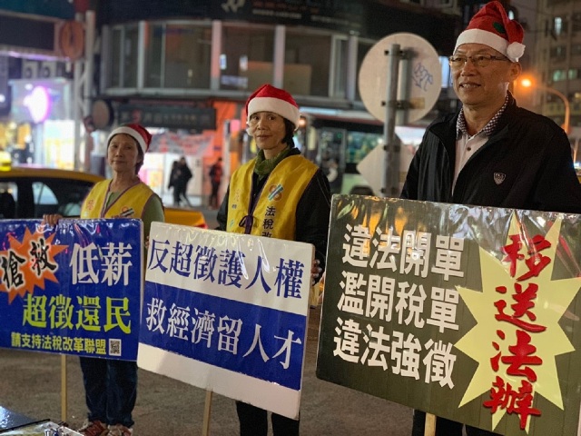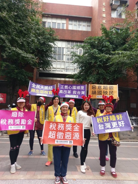法稅改革聯盟劉姓志工表示,72年前的今天,1946年(民國35年)12月25日三讀通過《中華民國憲法》。檢視我們的國家,在台灣,目前稅務機關仍然用沒有經過立法程序的9000多條解釋函令綁架司法,讓行政權獨大,戕害人權,我們要改革,稅務要人權,沒有稅災,百姓才能在行憲紀念日也是聖誕節,過「大家喜洋洋」的聖誕節。
