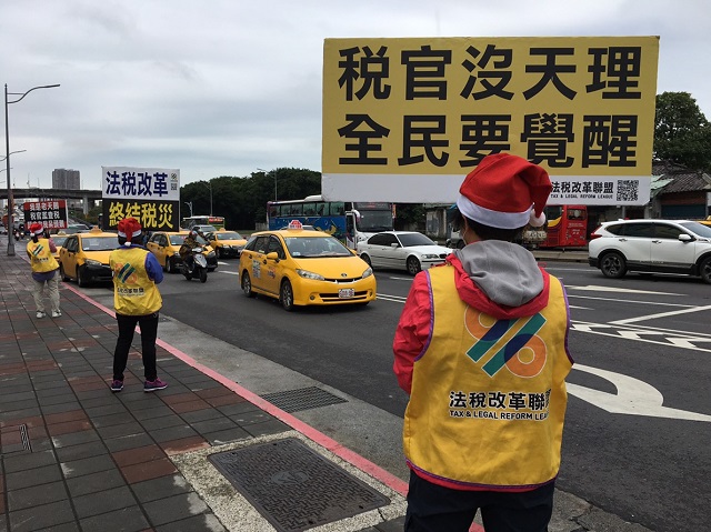 12/25聖誕節,孩子們無不期盼聖誕老人捎來心中企盼的禮物。但這一天,更是開啟中華民國主權在民的日子──行憲紀念日。當天台北國稅局大門外的重重路障依舊,離路障不遠處卻來了一群穿著黃背心的聖誕老人,有些向路過的民眾分享法稅知識,有些靜默的舉著看板「濫開稅單 逼我協商 多少繳一點!」、「法稅改革 終結稅災」、「小心!小心!違法濫開稅單 小心挨告!小心挨告!」,表達希望政府落實稅改的衷心期盼。