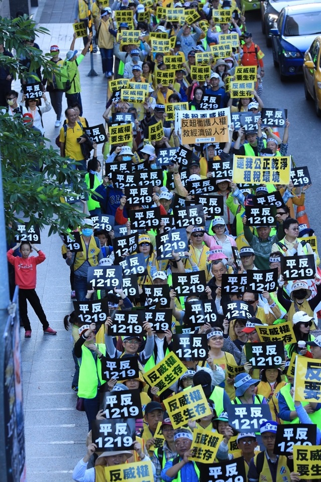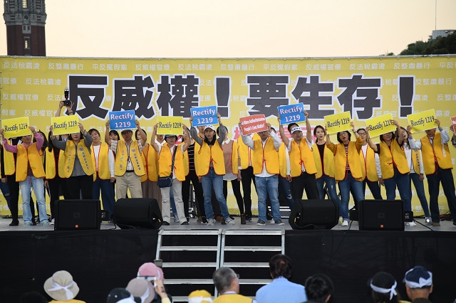 2018年12月19日下午凱達格蘭大道舉行「反威權 要賦稅人權」的黃背心運動,萬人吶喊「反威權!要生存!」許多華僑也特地搭機返台力挺,揭發1996年第一屆民選總統選後的政治整肅災難,訴求「成立平反1219委員會」、「召開稅改國是會議 導正稅法與稅制」、「停止賦稅黑箱作業 終結萬年稅單」,呼應法國黃背心運動,透過上凱道向政府發聲,要喚醒政府:人民的幸福絕對是當官最重要的目的。