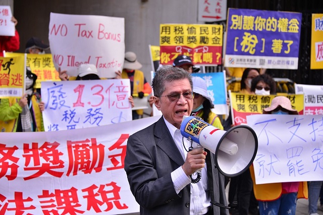 法稅改革聯盟發起人臺灣財經刑法研究學會理事長陳志龍教授:財政部年終有4.6個月,還要稅務獎勵金,貪官越來越多,經濟沒有成長,民進黨如果公然敢護航,2020年讓他全部下台。人民辛苦賺的錢被貪官汙到口袋裡,要求記名表決,不支持刪除獎金,就罷免。