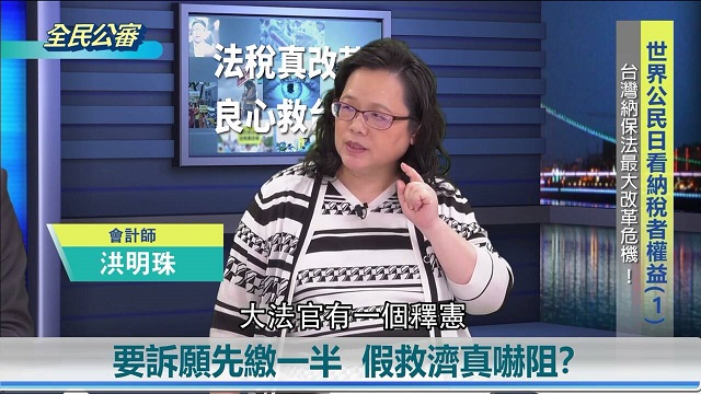 納保法從2017年底實施以來一年半,當初的立法美意,卻無法落實執行,納保官由國稅局派遣擔任,公平性令人質疑。賦稅人權是世界公民的基本權利,保障納稅人權也是納保法當初的立法宗旨,聯合國NGO世界公民總會副主席洪道子博士,強調良心的重要性,尤其在法稅方面,良心當為立法者的準繩,制定的法律須『以義為利』,不可『以利為利』,法官則應本於良心,依法獨立公平審判,才能提升人民對司法的信任。關注稅制改革的公益節目「全民公審」,第56集http://www.worldpeoplenews.com/content/video/315779邀請到文明人權服務協會理事長張凱鈞、東吳大學法學院法律學系專任教授陳清秀、會計師洪明珠等專家學者一起從納保法的角度探討賦稅人權的保障及其修法的必要性。