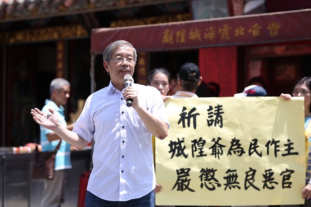 法稅改革聯盟發起人之一的陳志龍教授也到現場,陳教授說,到此不免心情沉重,時逢中元節前夕,天災不能預防,但人禍可以避免,最大的人禍是政府犯罪。1947年2月28號,因為查私菸引發一連串的屠殺事件,政府至今沒有真正跟人民道歉。從二二八、白色恐怖到1996年宗教掃黑,有很多人是被整死,而元凶包含總統級、部長級、檢察官侯寬仁等人,這些事都必須平反。中元節更深的意義是要幫助受冤的人,對於加害人也要找出來制裁,在人間的惡官都應該要抓起來,人民才能真正平反。