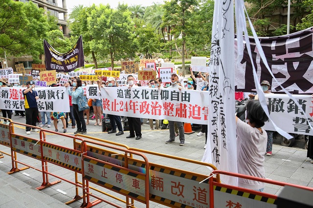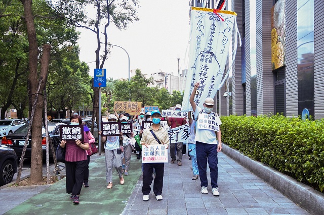 7月9日當天民眾仿效「耶利哥的毀滅」,手持標語靜默繞行行政執行署七圈,表達推倒假案整肅高牆的決心,以杜絕官員濫權違法。不少路過的居民停下腳步關心,一位附近住戶小姐表示,感受到現在的媒體都不報導真相,事實被掩蓋,年輕人都受到影響,難分真偽對錯,走時拿著志工給的宣導法税傳單,強調她願意幫忙傳遞訊息,並對志工打氣加油。