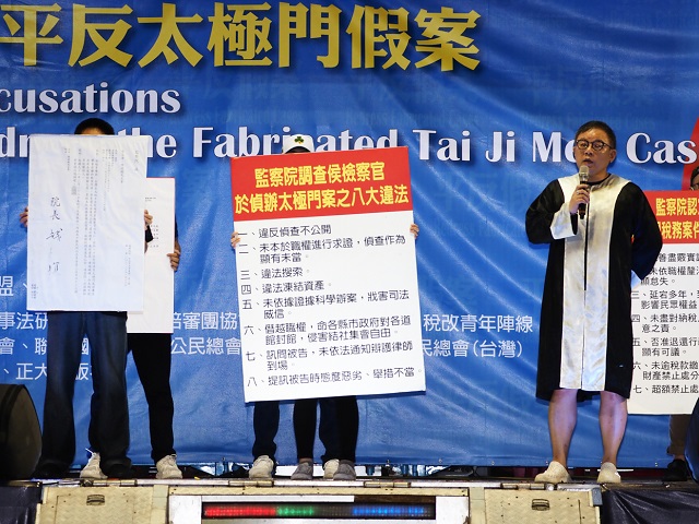 延宕24年太極門假案未獲得真正平反?十三年前就已經三審判決無罪無稅確定,敬師禮性質為贈與,屬免稅所得,如今卻面臨即將被違法強行拍賣。主辦單位呼籲,藉由平反太極門假案終止政治整肅迫害,全民拒絕假案整肅,拒絕假證據、假起訴、假稅單。現場影片播放「1996臺灣假案整肅」背景,臺灣財經刑法研究學會理事長陳志龍教授指出,「1219太極門案為假案,當時背景是無中生有,主觀是要滅門,證據是構陷,變成政治、刑事、稅務的假案,三假合一。」