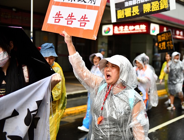 最近才被人民怒告的行政執行署署長林慶宗、副署長陳盈錦,至今不回應人民的陳情與請求。來自北台灣的青年世代,在遊行隊伍中以顯著的標語,控訴行政執行署三大罪狀-「惡霸執行強搶民產坑殺人民」,六位青年正義使者手持六色光劍盾牌,以「告、斬、令、告告告」來表達人民憤怒的心聲。