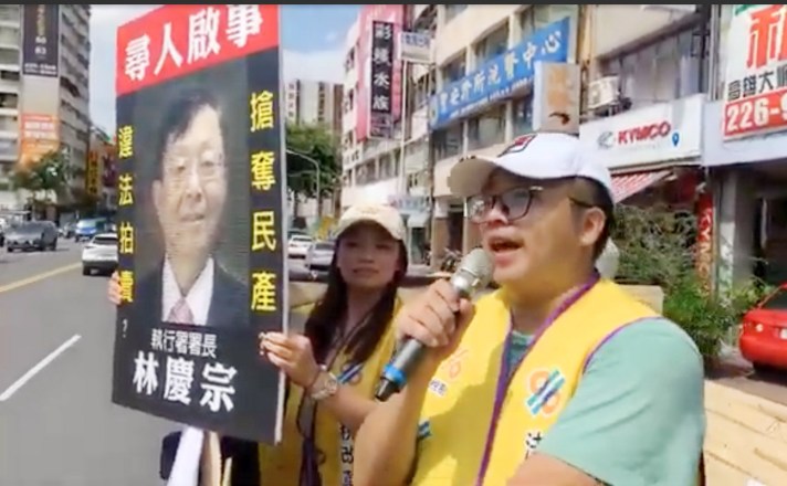 「大家看清楚,他叫做林慶宗,是法務部行政執行署署長,他搶奪民產,違法拍賣,很惡質!」「我們辛苦存的血汗錢,忍心被惡劣官員拿去違法拍賣分績效嗎?」直播主持人高舉尋人啟事,手指斗大官員照片,指控違法官員騙總統、騙立委、騙全台人民,破壞台灣的民主法治,人民已經陳情超過一個月,都沒有出來面對,全台灣被強制執行的受災戶也都在找他,請大家幫忙找出來,讓他接受全民公審,司法審判!
