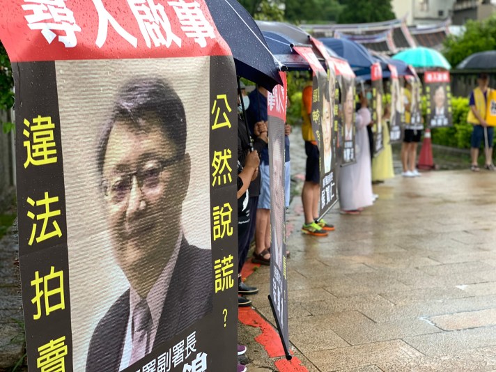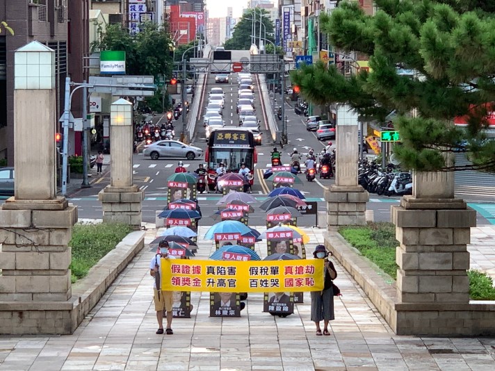 「一張不合理的稅單,我們辛苦存的錢,就這樣進了國庫,再換成績效獎金進了官員的口袋,這就是強搶民產的流程。」支持法稅改革的海搜團在街頭撐起一把一把的雨傘,在雨傘前面掛著執行署署長林慶宗、副署長陳盈錦,以及太極門假案始作俑者侯寬仁檢察官的照片,用廣播車不斷巡迴放送尋人啟事,呼籲全台灣的人民本著公義及良心,一起把故意神隱的惡官揪出來。
