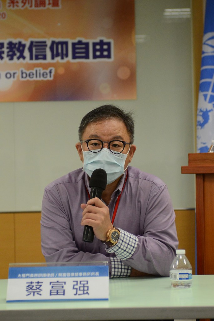 「剝奪思想、信仰、宗教自由是違反國際法的,台灣不能這樣!」聯合國/NGO世界公民總會人權觀察員Chih-Chung Wu直言。他以英國宗教自由為例,表示英國因為開放宗教自由而終止內戰殺戮,開始成為一流國家甚至統治全世界。因此宗教自由非常重要,聯合國的國際兩公約在台灣已經國內法化,全國都須要遵守,國際公約保障宗教自由。公民與政治權利國際公約第18條指出,人民有自己表達自己信仰的方式,政府應該保障,法律上也不應該阻止迫害,例如人民表達敬師禮是贈與,法律上就應予以尊重。再看台灣政府如何保障宗教自由,當時林達檢察官出書內容指出,1996年執政黨當時針對幾個宗教團體,藉由媒體渲染、國稅局查稅,為掩人耳目,也抹黑武術團體違反稅捐稽徵法,違法強徵課稅,監察院91年調查檢察官有8大違法,請法務部從嚴究責議處,但法務部藉故拖延至10年後,以超過懲戒時效為由不懲處,也令監院相當不滿。