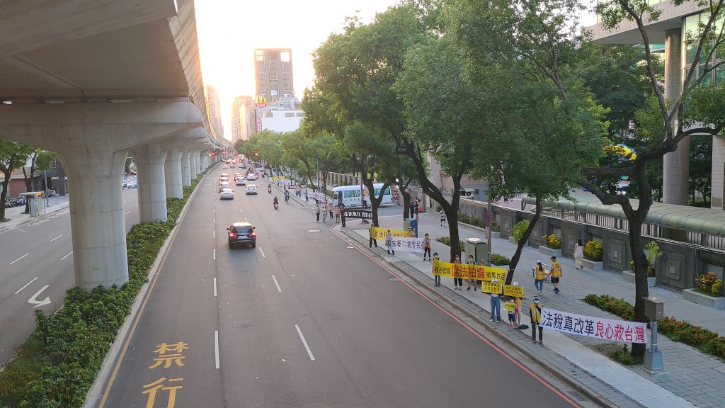 圖1:由法稅改革聯盟及平反1219行動聯盟發起,於台中市文心路西側人行道以人龍高舉抗議標語,築出一道憤怒的長城。