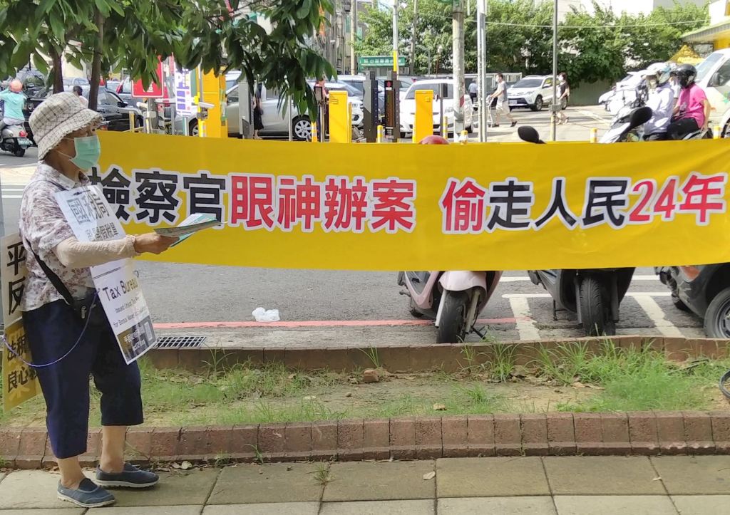 8月底最後一個假日,一連兩天早上,九旬志工蘇姓阿嬤都到市場前發「三人之錯毒害全國」傳單,控訴廉政署副署長侯寬仁24年前捏造的太極門假案形成假稅單;甚至傳出國稅局與行政執行署為了瓜分績效獎金,聯手違法強行拍賣太極門的土地,搶奪民產。九旬蘇姓阿嬤志工,站出來控訴國家「違法拍賣 侵害人權」!她說:太極門氣功養生學會成立於民國55年,是氣功武術修行門派,從來都沒有課稅上的問題,國家應該還給太極門公道,也還台灣人一個公平正義。 她並表示,「根本就沒有稅的事,怎麼可以亂講!做人不可以沒良心!國家不可以迫害人民。」