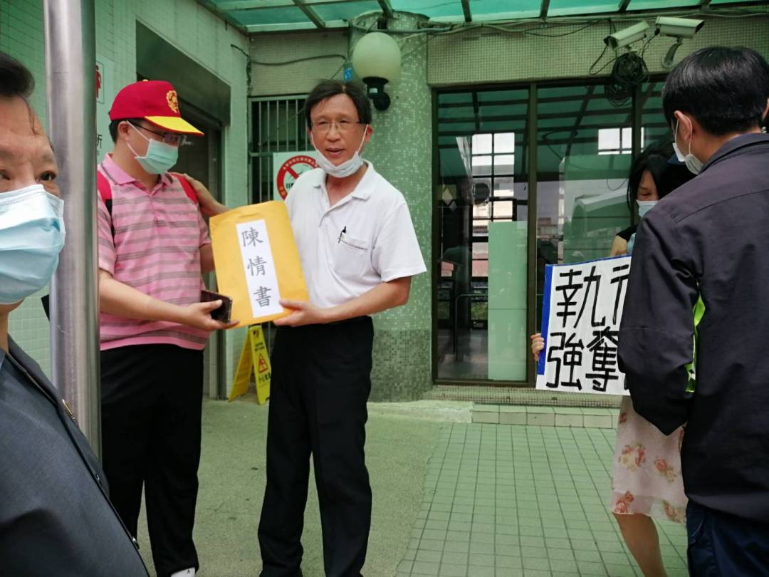 「太極門沒欠稅,行政執行署竟違法拍賣土地,強行收歸國有!」9月1日上午行政院院長蘇貞昌親臨台鐵中壢後站視察桃園鐵路地下化辦理情形,匯報現場一位民眾「攔轎」喊冤被警察圍堵架走。蘇貞昌結束離去時,另三五成群的民眾也擁上大喊:「院長主持公道!」「違法拍賣!」卻遭一群警力強力驅離!中壢分局保防組組長陳東堯主動上前表達關切,向陳情民眾表示會代為轉交陳情書給蘇院長,陳情人士盼蘇院長主持公道,真正解決太極門假稅案,歸還違法拍賣的土地。