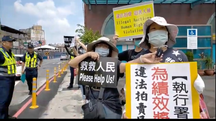 一群法稅改革聯盟志工和平反1219行動聯盟志工們被警察以這是管制區為由,把他們阻卻在會場百米之外,只能在周邊立體停車場前拉起「違法拍賣 迫害人權」等布條,或高舉「救救人民!」「執行署為績效獎金違法拍賣民產!」等標語表達訴求,希望蘇貞昌院長能看見。