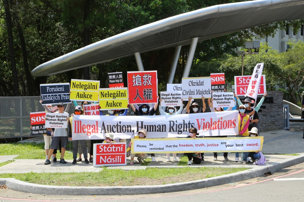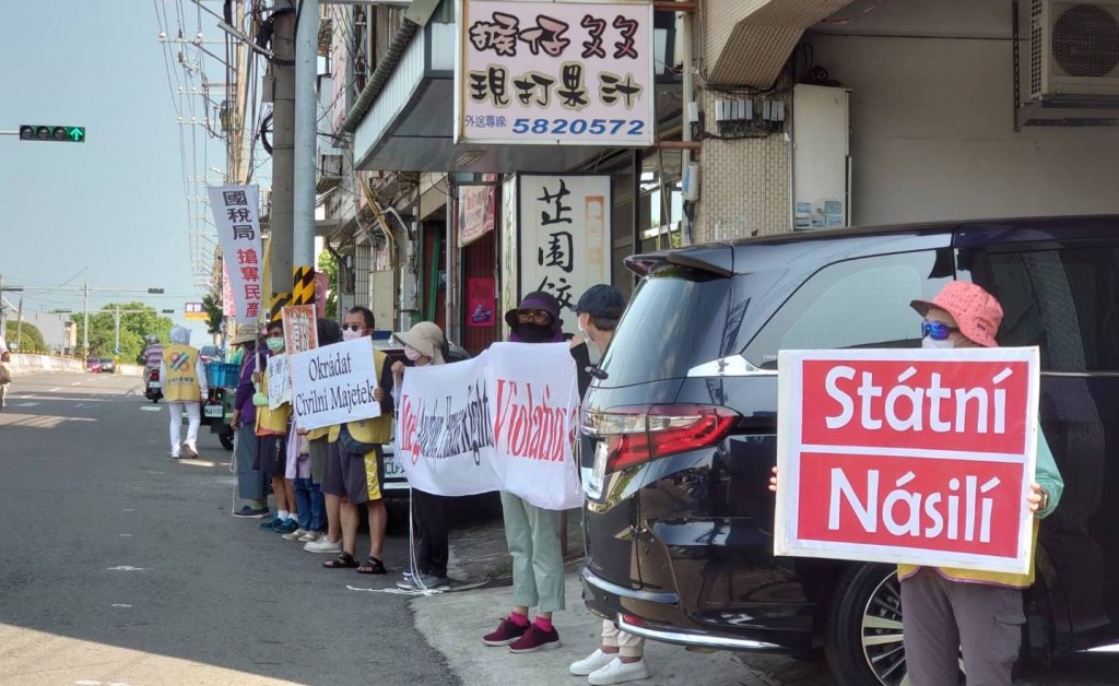 圖說一:法稅改革聯盟、平反1219行動聯盟及聲援太極門假案的民眾,在工研院舉牌拉布條,向捷克代表團告洋狀,希望捷克參議院議長韋德齊,呼籲小英總統停止違法拍賣人民財產、侵害人權。