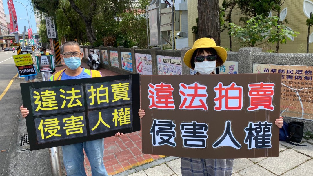 圖說二:法稅改革聯盟志工,在街頭舉標語抗議國稅局、行政執行署聯手違法強行拍賣人民的財產,造成人民求助無門、痛不欲生。